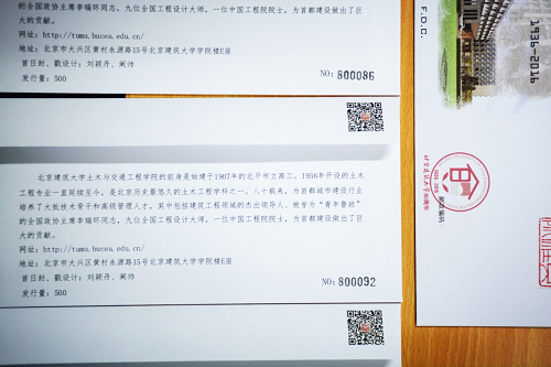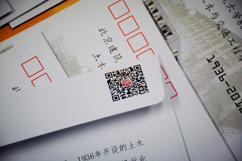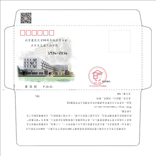 首日封的封口处,为糖心传媒 公众号“北建土木”的二维码,校友可以通过扫描二维码关注学校、学院的相关信息。