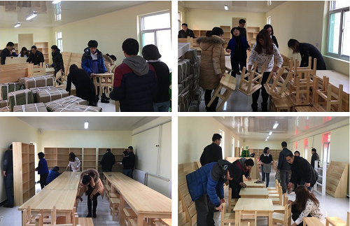 这排有些破落的平房就是要建立的图书馆,走进平房,里面的环境与外观截然不同:淡绿色的墙,瓷砖的地板,敞亮的空间里散发着实木的芬芳,书架,书桌,座椅还未码放,图书们静静地堆放在一起。在图书馆内,我们见到了段英老师,段英老师是然尔阅读公益发展中心的创始人,一年多来,然尔中心共投入30多万元,为阜平镇10所学校组建图书馆、图书角,捐赠1万多册图书,惠及近8000名学生。本次实践活动的重要内容就是同段英老师以及然尔公益的志愿者完成城厢中学图书馆的建设。简单的相互介绍后,大家便开始行动:码放并擦拭书架、书桌、座椅;将图书拆封、分类、贴标签、上架。实践团共手写4522本图书的标签,对面数量庞大的图书,在然尔志愿者的配合下,经过8个小时的分类、查找和整理,最终完成了城厢中学图书馆的建设,上架完毕已接近晚上10点,大家虽然很疲惫,但看到整齐的图书馆,心中尤为的自豪。