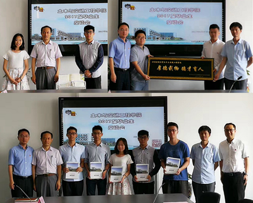 2017届毕业生自入学以来,勤奋学习,踊跃参加各项活动,涌现出一批德、智、体、美等全面发展的优秀学生。其中,刘强等35名同学荣获北京建筑大学优秀毕业生荣誉称号,潘硕等11名同学荣获北京地区高校优秀毕业生荣誉称号。与会学院教师上台为毕业生代表颁发荣誉证书。