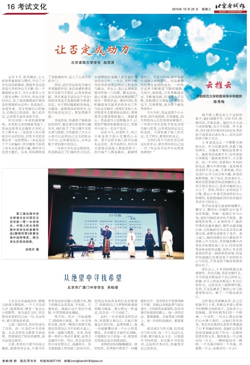 站在今天,回望昨日的自己,我已不再是那个胆小怯懦的小女孩,因为他人的评论就失去自我。我更开始明白,我们并不需要活成他人期望中的样子,因为每一个人都是最好、最独特的自己。否定与非议,并不是我们前行道路上的绊脚石,而是激励我们勇往直前的动力。不要被一时的否定桎梏住渴望飞翔的翅膀,天很大、海很蓝,只有勇敢地尝试、不断地突破,在逆境中不言败,在跌倒后又爬起,才能看见远方、实现梦想,成为那个最优秀的你!