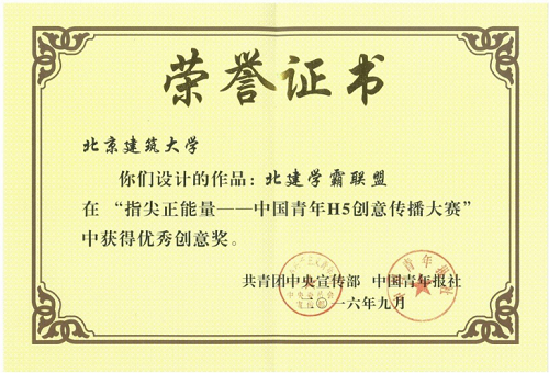 由共青团中央宣传部、中国青年报·中青在线、中国高校传媒联盟共同主办的“指尖正能量——全国青年H5创意传播大赛”正式落幕。我校2项参赛作品入围决赛,其中作品“北建学霸联盟”在本次大赛中首次在全国网友前亮相,并获得优秀创意奖。