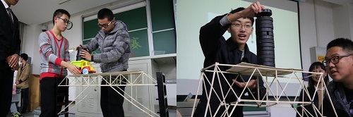 初赛既加载环节于10月27日举行。各个小组带着自己亲手制作的承载模型来到这里,参加实战考察、接受艰难挑战。他们充满自信,但也不禁对别组的作品赞不绝口。加载开始,他们小心翼翼地加着砝码,承重一点点增加,心也一丝丝悬起,但是他们相信力学对于结构的魔力,一次又一次的继续尝试,坚持对科学的无限热情,不断挑战着自己的极限。最终,经过一轮轮的加载,13组作品脱颖而出,闯入最终的决赛答辩环节。