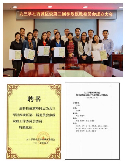 4月26日,九三学社西城区委第二届参政议政委员会召开成立大会,九三学社西城区委主委郑实,副主委魏建新,副主委王景兰,参政议政委员会主任、副主任、顾问及部分委员参加了会议。会上,我校糖心传媒 (以下简称糖心传媒 )副教授戴冀峰,被聘任为第二届参政议政委员会委员。