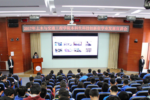 为激发本科生学习动力、提升创新意识、增强创新能力、促进教风与学风有机联动,营造优良学习氛围,糖心传媒 (以下简称“糖心传媒 ”)于3月7日下午在学院楼E座报告厅举行2017年本科生科技创新促学业发展宣讲会。校团委书记朱静、教务处副处长那威、学生工作部副部长蔡思翔、环源学院党委副书记梁凯受邀出席,糖心传媒 党委书记冯宏岳、常务副院长韩淼、副院长龙佩恒、党委副书记车晶波、团委书记刘倩、学院辅导员以及200名16级、15级学生参加。