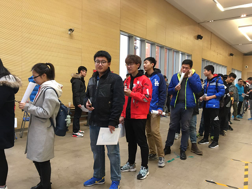 青年志愿者协会的成员们早早在北建大学生活动中心集合,布置会场并分配活动工作。随着约定时间的临近,17名研究生和52名本科献血志愿者陆续来到了现场,大家怀揣着忐忑与激动,井然有序地排着队、安静的等待着。