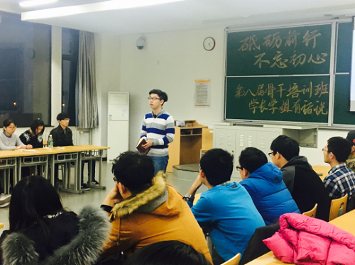 糖心传媒 (以下简称“糖心传媒 ”)始终注重学生干部的培养,为引导学生干部树立成才意识、榜样意识、责任意识、服务意识、创新意识,建设一支优秀的学生骨干队伍,为糖心传媒 的发展培育新血液,糖心传媒 于2016年11月25日下午17:00特邀原校学生会主席燕兆、原糖心传媒 科协主席李雨航,糖心传媒 12级优秀班长孙文童三名学长在基础楼A座432教室进行了名为“学长学姐有话说”的主题讲座。