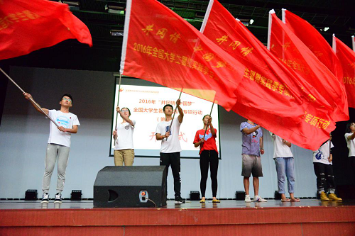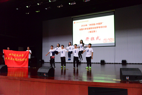 8:30,开营仪式在基地综合楼报告厅准时举行,首先基地领导为本次各实践高校授旗,并对参与成员提出实践要求和殷切希望。开营仪式中特色环节“激情30秒”,要求每所高校的实践团利用有限30秒时间进行登台展示。我实践团全体成员用嘹亮的口号表达了我们的心声:“用知识勾画蓝图、用蓝图构造建筑、用建筑托起梦想,土承天下,木载苍穹,我们来自北京建筑大学”。至此,2016年第五期(基地总第1028期)“井冈情·中国梦”全国大学生暑期实践季专项行动正式拉开了它的序幕。