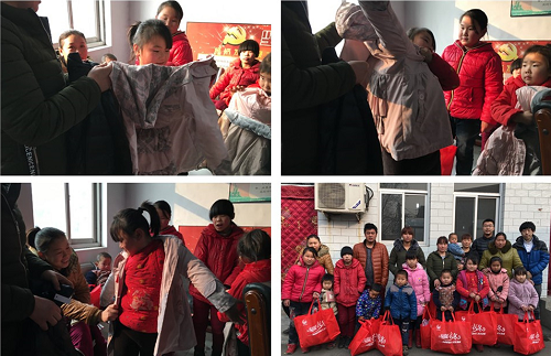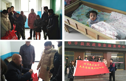 为帮助青年大学生走进基层、深入思考,用实际行动“认识社会、回报社会”,积极倡导“随手微公益,传播正能量”理念, “星火扶贫”实践团在助力阜平教育脱贫的同时,也为山村的孩子和老人带去了冬衣,为他们送上冬日的温暖。2017年1月17日上午,实践团兵分两路,由党委副书记车晶波和团委书记刘倩分别带领3人,前往阜平县平阳镇和民政事业服务中心,为当地的孩子和退伍老兵送去冬日的温暖。