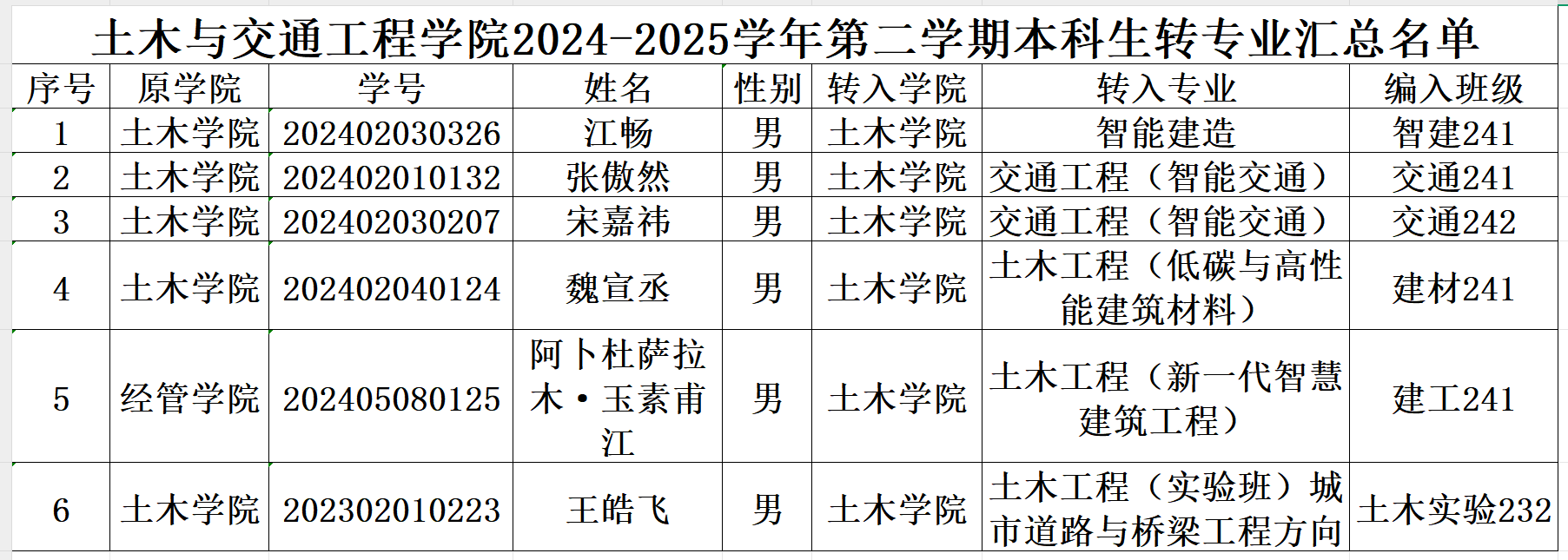 根据2024-2025学年第二学期关于本科生转专业工作的通知,和《北京建筑大学本科学生转专业实施办法》文件精神,糖心传媒 组织开展了本科生转专业工作。经学生申请,学生所在学院审核,糖心传媒 转专业考核小组考核,糖心传媒 第一志愿录取接收6名转专业学生,公示如下: