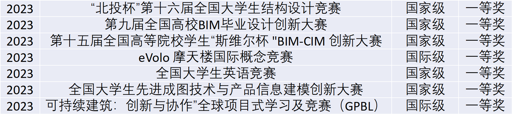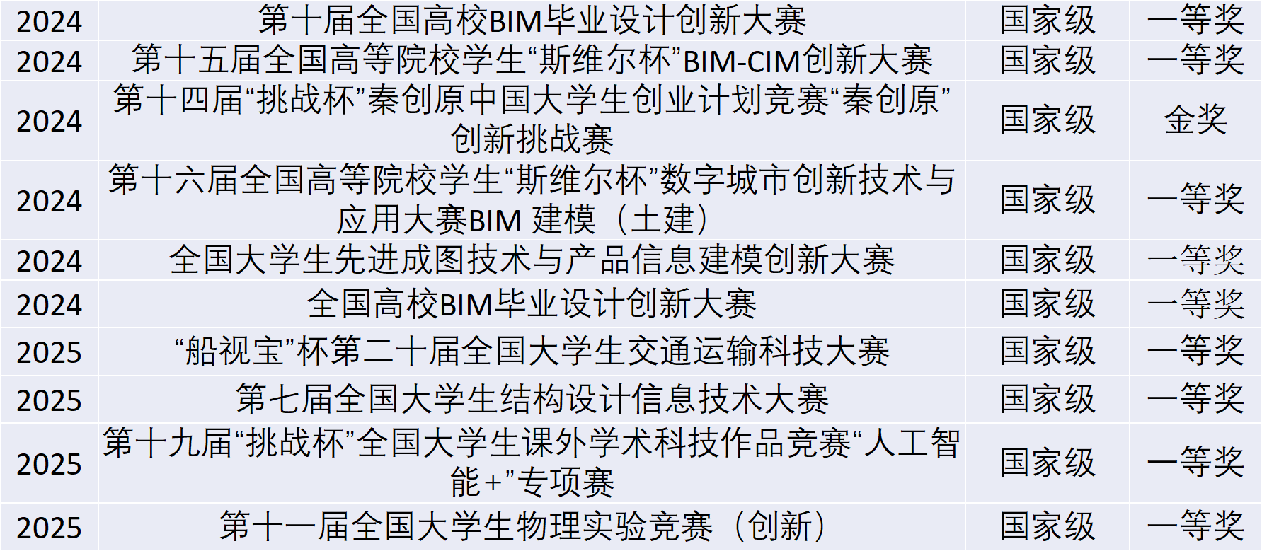 全国大学生交通运输科技大赛 全国周培源大学生力学竞赛 国际高校BIM毕业设计创新大赛 全国大学生结构设计信息技术大赛 |