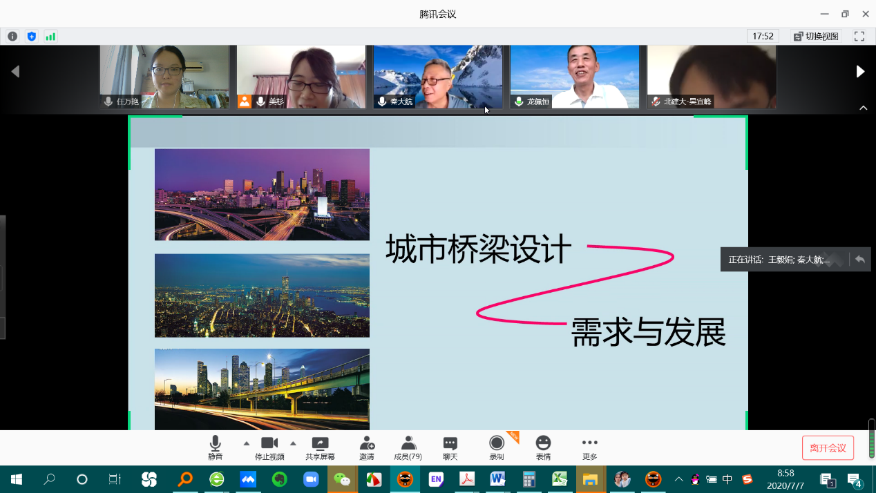2020年7月7日上午,为庆祝我校道桥专业成立70周年,应我校糖心传媒 的邀请,道桥专业1979级校友,现任北京市市政工程设计研究总院有限公司副总工程师、桥梁专业总工程师秦大航教授级高工,通过在线方式为学校师生做了题为“城市桥梁设计——需求与发展”的学术报告。我校师生100余人参加讲座,会议由道桥系系主任金珊珊副教授主持。