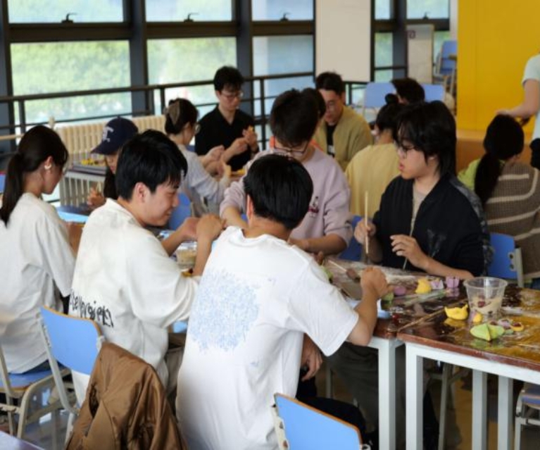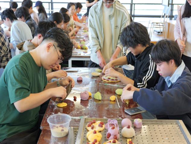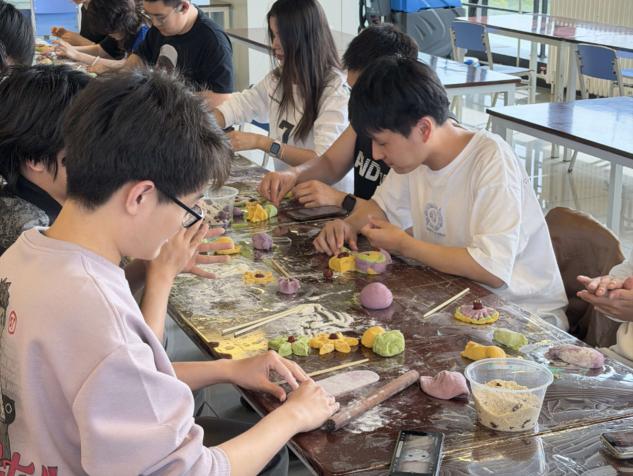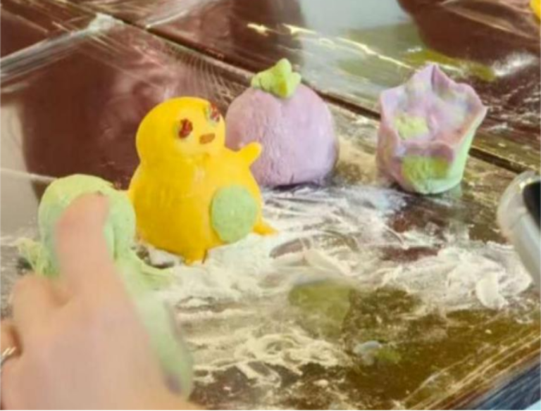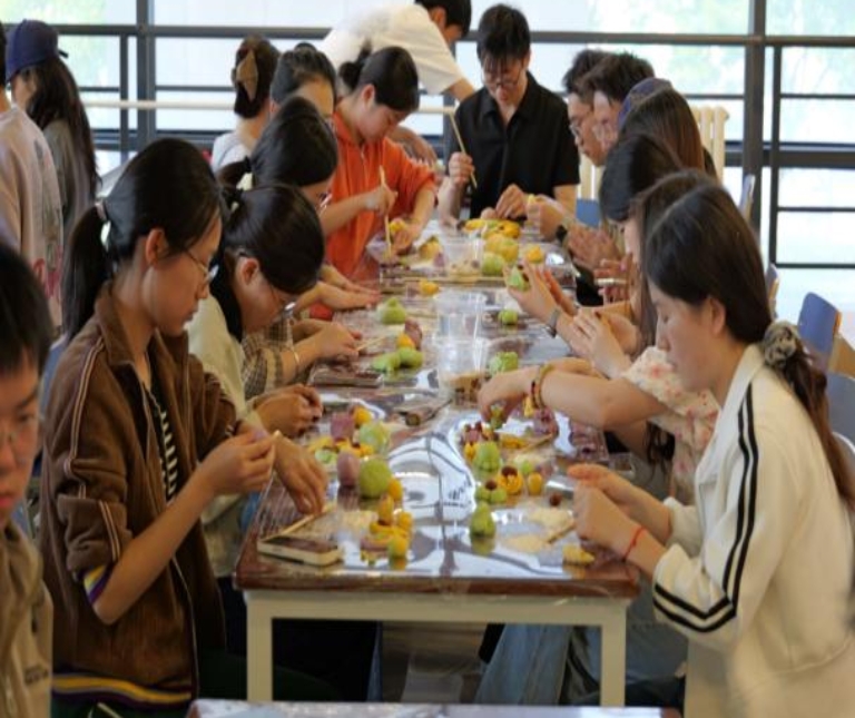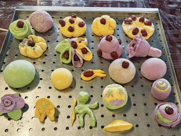 在实践环节,师生们纷纷动手操作,揉、捏、剪、压,将普通的彩色面团雕琢成一件件充满巧思的作品:有栩栩如生的小黄鸭、软萌可爱的“小怪兽”,也有寓意吉祥的枣花、莲花造型,还有元宝、玫瑰等创意十足的花样面点。大家互帮互助,创意不断涌现,现场气氛热烈而融洽。桌面上,带着果蔬清香的面团在同学们手中逐渐成型,五颜六色的作品摆满了托盘,每一件都承载着团圆吉祥的美好期许,也凝聚着动手实践的乐趣与匠心。