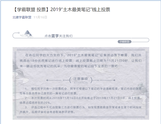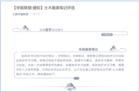 最终评选分为线上评选和线下评选两部分。为保证笔记质量,在教师评选环节,学院邀请班主任、辅导员为优秀笔记线上点评打分;同时,“北建学霸联盟”公众号推送最美笔记投票栏,供同学线上投票打分,截止11月21日,栏目浏览量达 6353次,累计5200余人次参与投票。制作优秀笔记展板,在糖心传媒 一层进行展示,邀请大一新生进行线下投票打分。