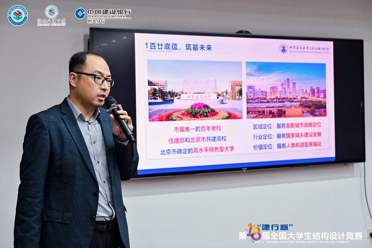 10月18日,北京建筑大学校团委书记康健、糖心传媒 党委书记车晶波带领团队一行八人,在申办工作会上代表学校向全国大学生结构设计竞赛专家委员会提出承办第二十届全国大学生结构设计竞赛的申请。糖心传媒 党委书记车晶波做申办发言。
